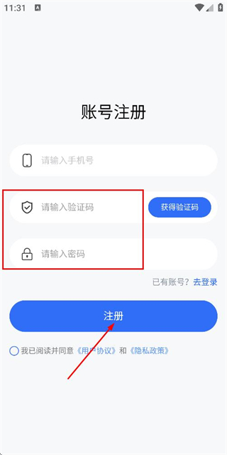 3、在注册账号页面填写验证码和密码,勾选协议后点击注册完成注册操作。