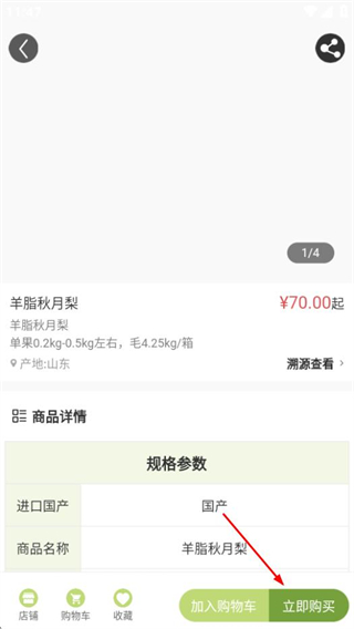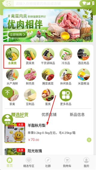 1、在线上南环桥首页,点击水果类下的目标商品可进入商品详情页。