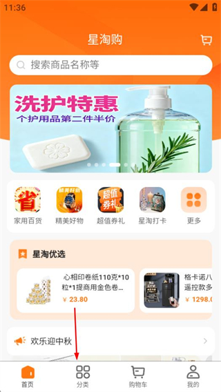 1、在星淘购首页,点击分类可进入商品分类页面。