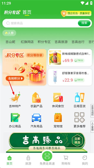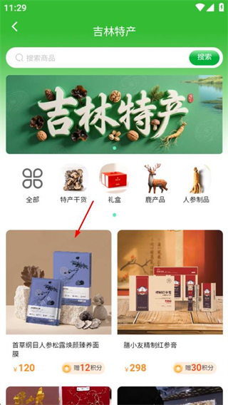1、在吉高商城首页,点击吉林特产可进入对应分类页面。