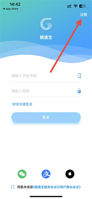 1、进入赣通宝app的登录界面后,点击右上角的注册选项,进入注册流程页面。