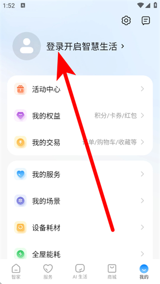2、在个人页面,点击登录开启智慧生活,进入登录页面。