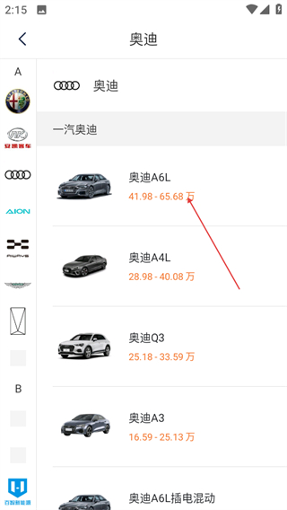 3、在奥迪车型列表中,点击奥迪A6L选项,可进入该车型的详情页面。