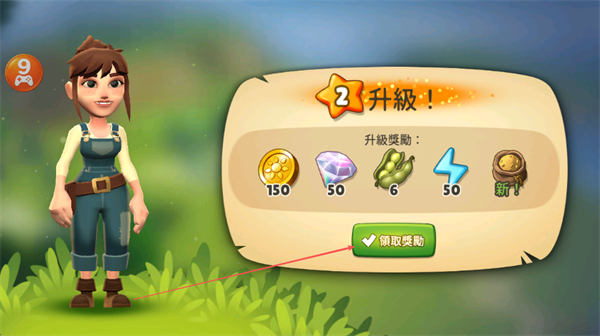 4、任务完成后角色升级,点击领取奖励获取金币、道具等升级奖励。