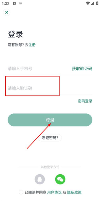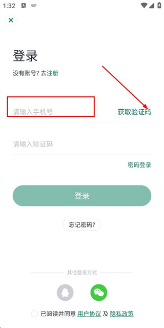 2、在登录页面填写手机号,勾选协议后,点击获取验证码。