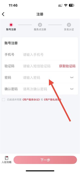 3、在页面依次填写手机号、获取验证码、设置密码,勾选协议后点击下一步,按提示完成后续步骤,即可完成账号注册操作。