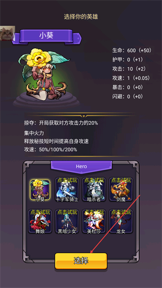 1、选择英雄小葵,其技能可掠夺敌方攻击、提升自身攻速,点击选择进入战斗。