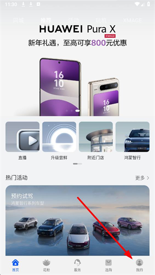 1、进入我的华为app后,在首页界面点击底部我的选项,进入我的个人页面。