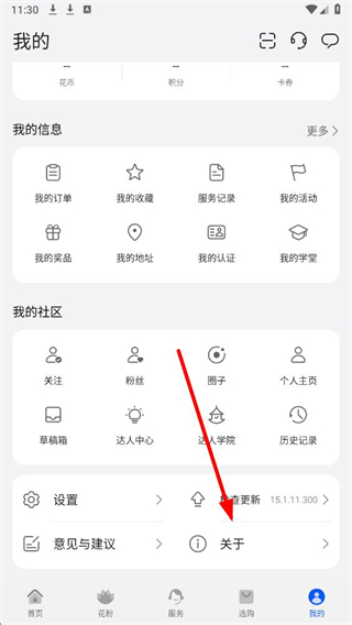 2、在我的个人页面中,找到关于选项并点击,进入关于相关的信息界面。