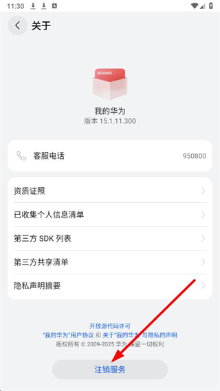3、在关于界面的底部区域,找到注销服务选项,点击即可进入注销服务的相关页面。