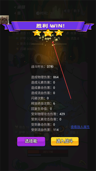 4、击败敌方后获得胜利,可选择选技能或进入下一场战斗。