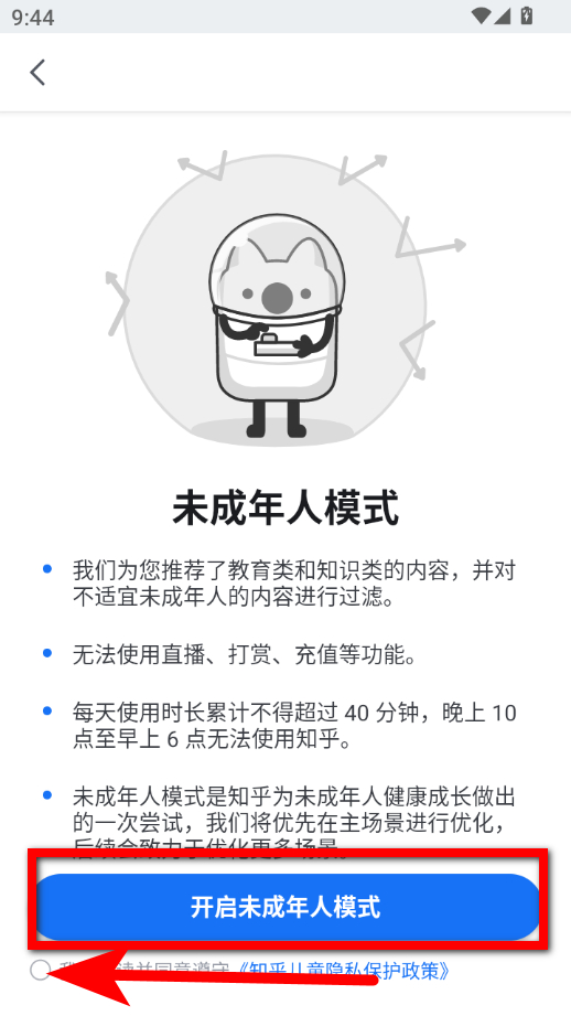 4、在未成年人模式说明界面,勾选同意协议后点击开启未成年人模式按钮,完成知乎未成年模式开启操作。