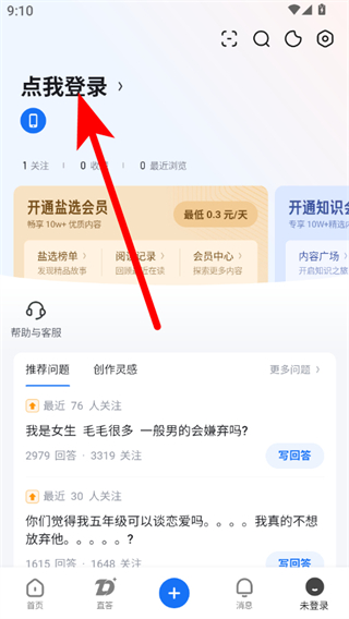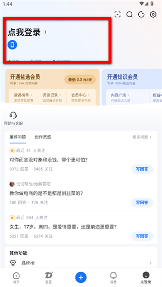 1、在知乎首页,点击右下角未登录选项,进入个人中心页面。