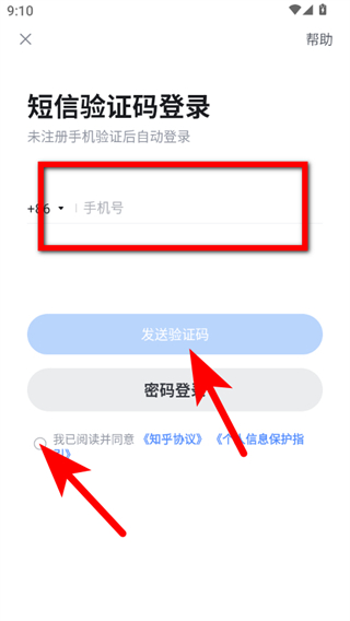3、在登录页面,输入手机号勾选协议后点击发送验证码,进入验证码输入界面。