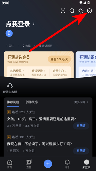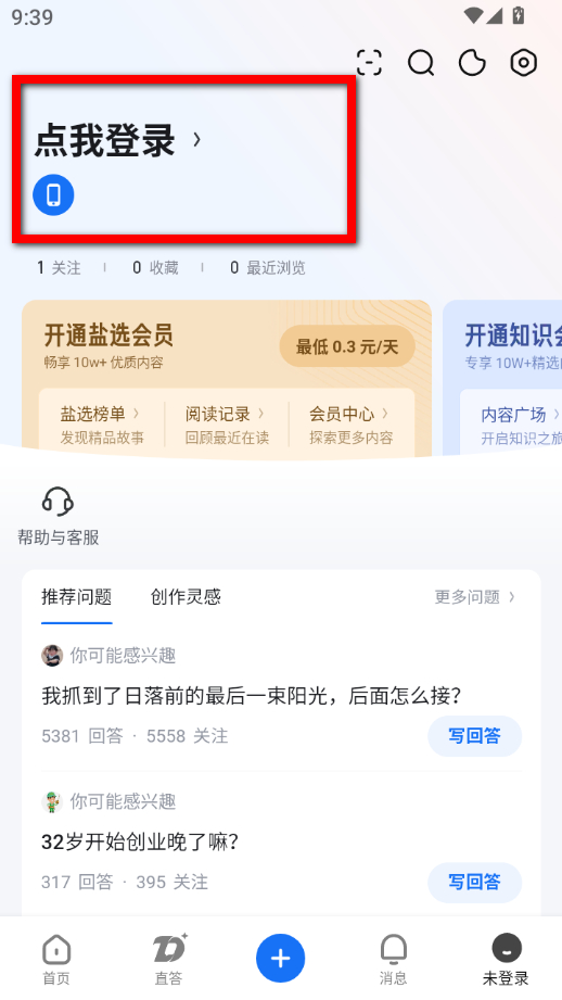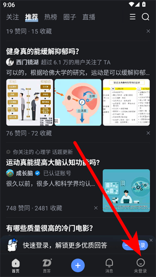 1、在知乎首页,点击右下角未登录选项,进入个人界面。