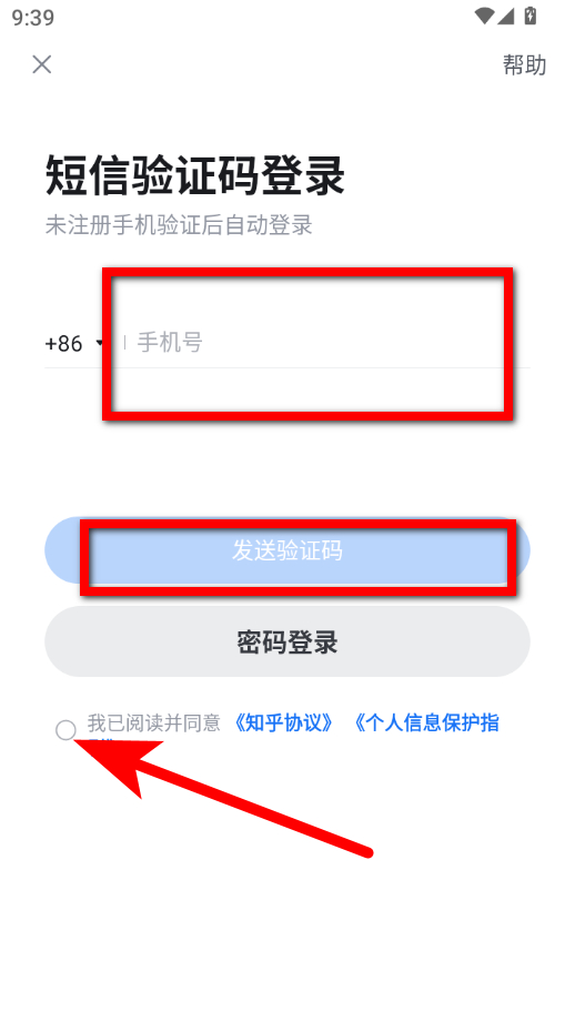 3、在短信验证码登录页面,输入手机号,勾选同意协议后点击发送验证码。