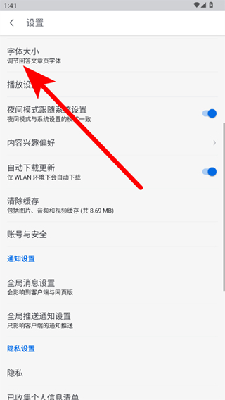 3、在设置页面,点击字体大小选项,进入字体大小设置界面。