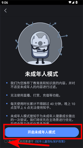 4、勾选同意协议后点击开启未成年人模式按钮,即可开启青少年模式。