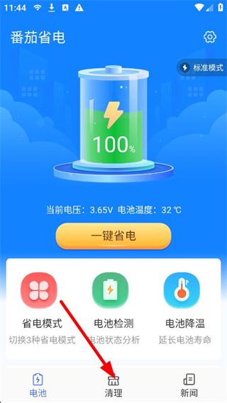 1、打开番茄省电app,点击底部导航栏的清理选项。