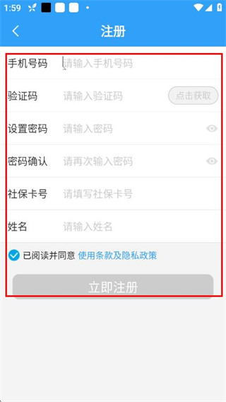 4、填写手机号码、验证码、密码、社保卡号、姓名,勾选同意协议,点击立即注册。