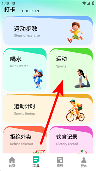 2、在打卡页面中,选择运动选项,进入运动打卡页面。