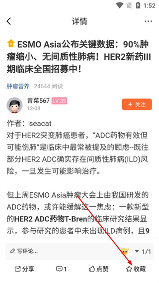 4、在帖子详情页,点击页面底部的收藏即可完成收藏。