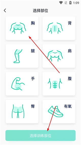 3、进入选择部位页面,挑选训练部位,点击选择训练部位。