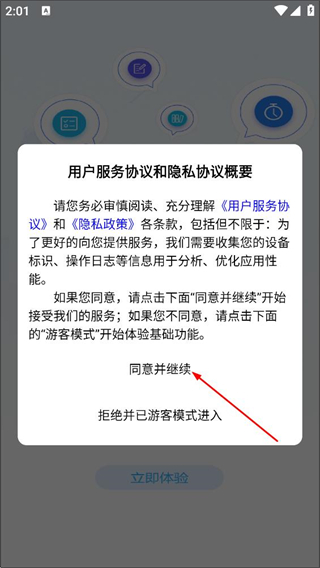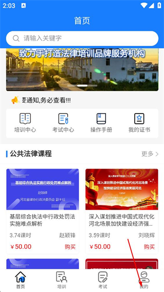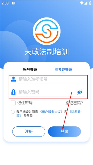 1、阅读用户服务协议和隐私政策后,点击同意,进入天政法制培训应用。