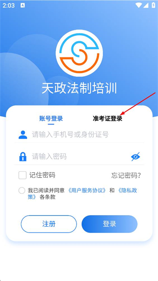 3、在登录页面,点击准考证登录选项,切换至准考证登录的表单页面。