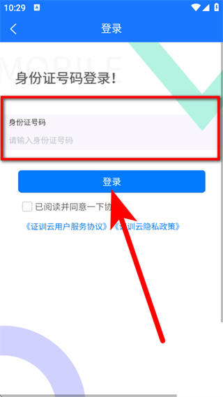 4、在身份证号码登录页面,输入身份证号码,勾选后,点击登录,完成登录。