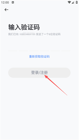 5、在输入验证码页面,填写收到的6位验证码,点击登录/注册按钮完成账号登录/注册。