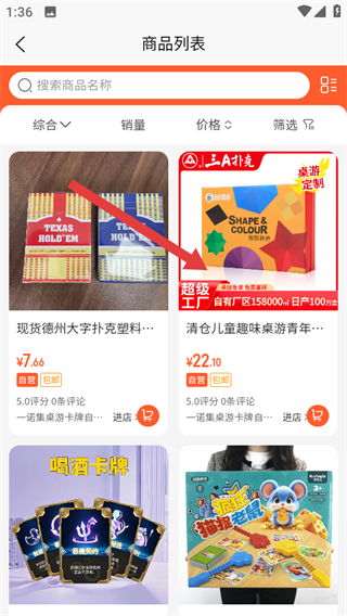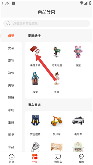 2、在商品分类页面,选择潮玩动漫分类下的桌游卡牌选项,可进入对应商品列表。