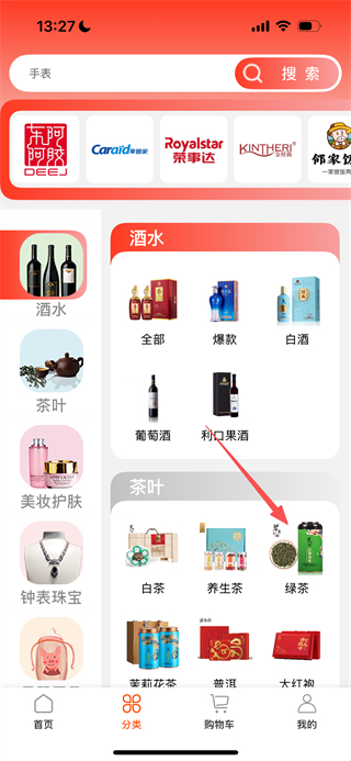 2、在分类页面中,点击绿茶选项,可查看绿茶类商品。