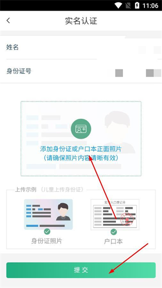 5、填写姓名、身份证号,上传身份证/户口本照片后点击提交完成认证。