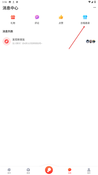 2、在消息中心的顶部功能栏,找到合唱邀请选项并点击,进入合唱邀请的列表页面。