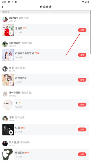 3、在合唱邀请列表中,找到想要参与的合唱邀请,点击其右侧的合唱按钮。
