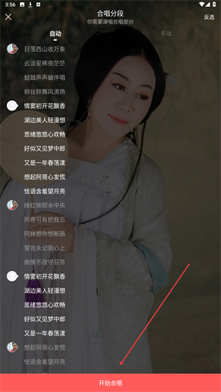 4、进入合唱分段页面后,点击底部的开始合唱按钮,即可参与该歌曲的合唱。