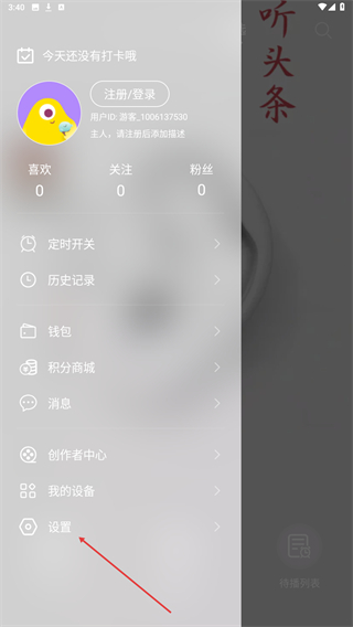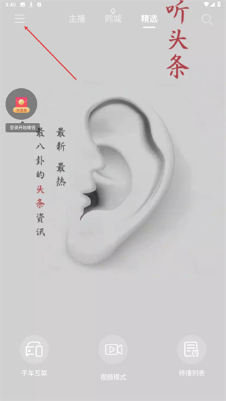 1、在今日电台的首页左上角,点击菜单按钮,展开侧边功能栏。