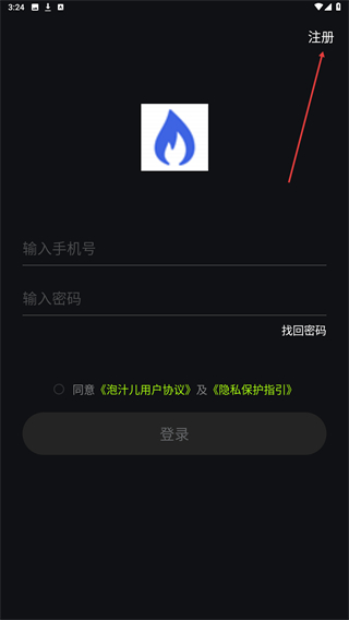 1、启动泡汁儿app,进入时点击右上角注册的按钮。