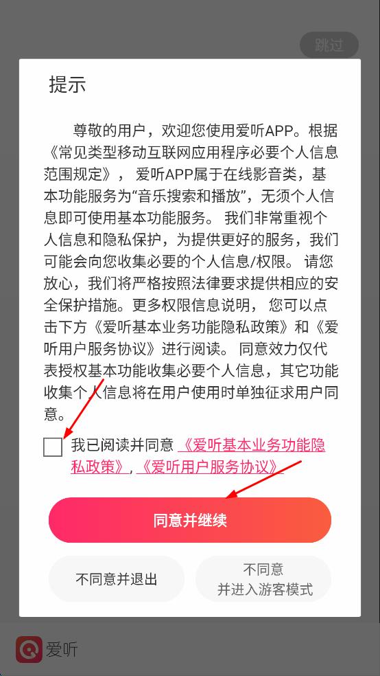 1、打开爱听APP,进入提示界面,需阅读并同意爱听基本业务功能隐私政策和爱听用户服务协议,勾选“我已阅读并同意”,点击“同意并继续”按钮。