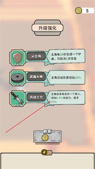 4、战斗后进入升级强化界面,选择属性加成如厉战之刃,提升主角战力。