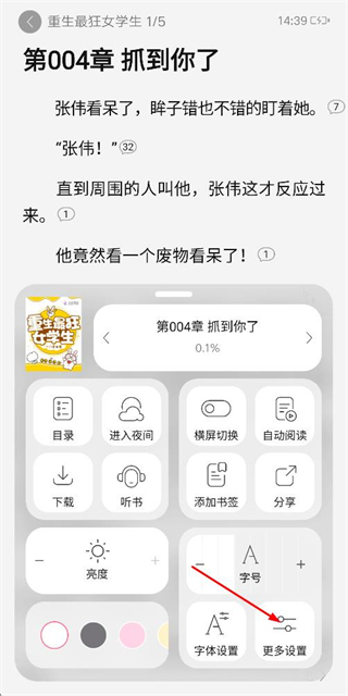 3、在阅读页面打开设置面板,点击更多设置进入阅读设置页面。