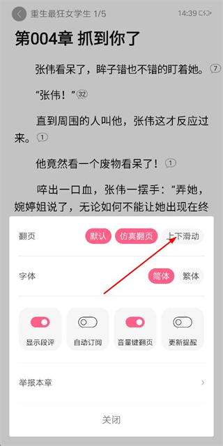 4、在阅读模式等设置页面点击上下滑动,完成上下滑动翻页设置。