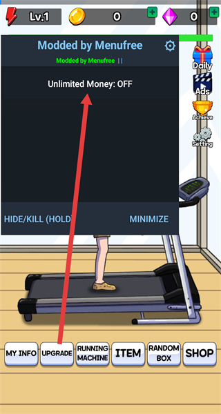 2、在菜单中,通过点击将Unlimited Money从“OFF”切换为“ON”,启用无限金币功能。
