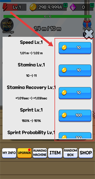 4、点击进入UPGRADE界面,消耗无限金币点击对应按钮,升级Speed、Stamina等属性,提升跑步能力。