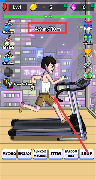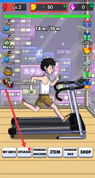 跑步过程随时间产出金币,可升级角色速度、耐力属性及跑步机等级,跑步机升级后每秒金币收益提升,为竞技与解锁内容奠定基础。