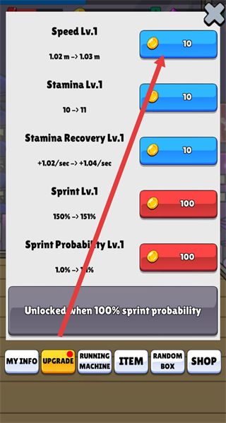 4、在升级界面中,点击对应属性如Speed右侧的按钮,消耗金币提升该属性等级。