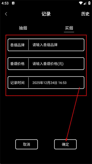 3、在买烟表单中,填写品牌和价格,确认记录时间,点击确定,完成买烟记录。