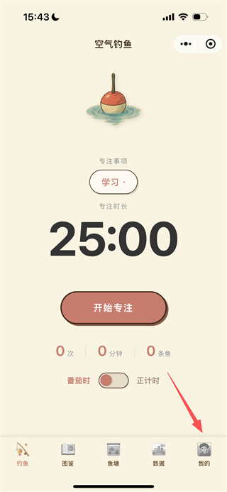 1、进入空气钓鱼后,点击底部的我的选项,可进入个人中心页面。