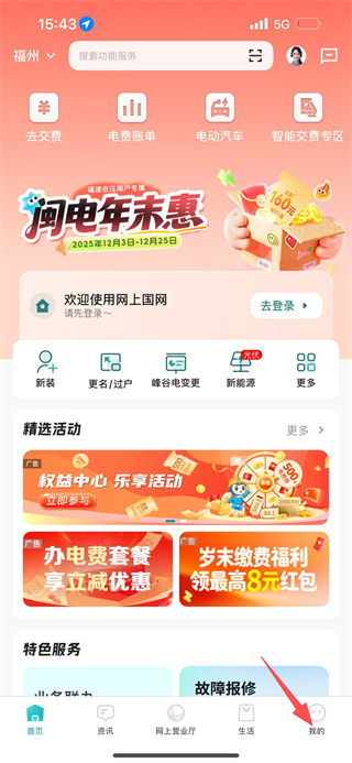 2、在网上国网首页,点击底部的我的选项,进入个人中心页面。